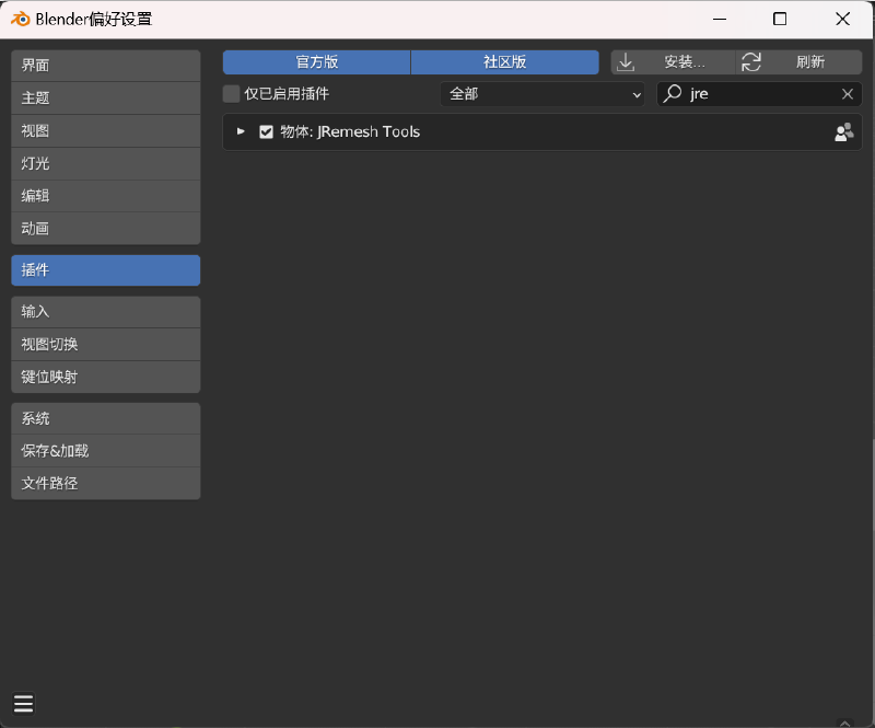 然后,将 jremesh-tools 插件导入到 blender 中: