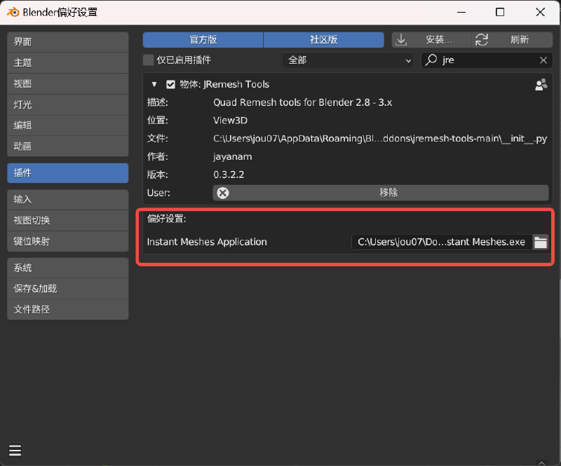 如果报错 JRemesh: Path to Instant Meshes is missing ,参考 JRemesh: Path to Instant Meshes is missing. #9,是 instant-meshes 的路径没有正确索引到。